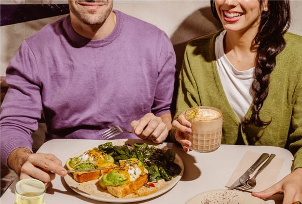 - Huevos benedict: Pan brioche con salmón ahumado o aguacate, salsa holandesa de calabaza y cúrcuma, acompañado de frutos secos y cebollino