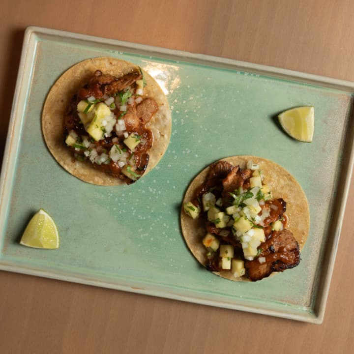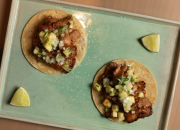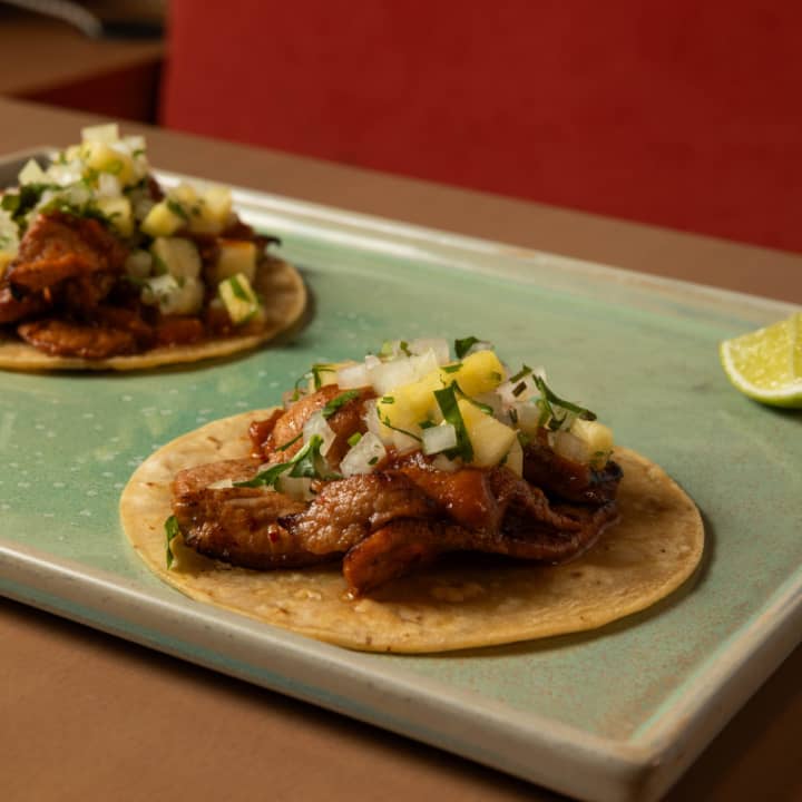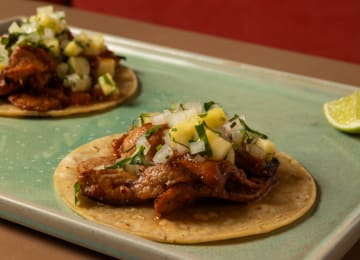 - Un taco al pastor de secreto ibérico con salsa de tomate verde, chipotle y jardín de piña