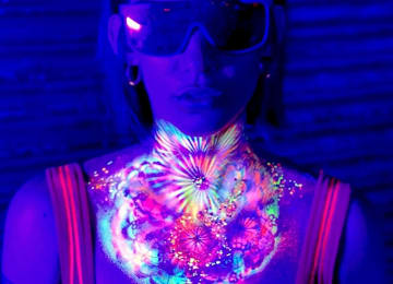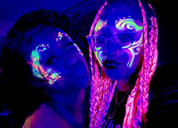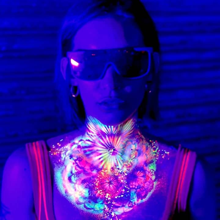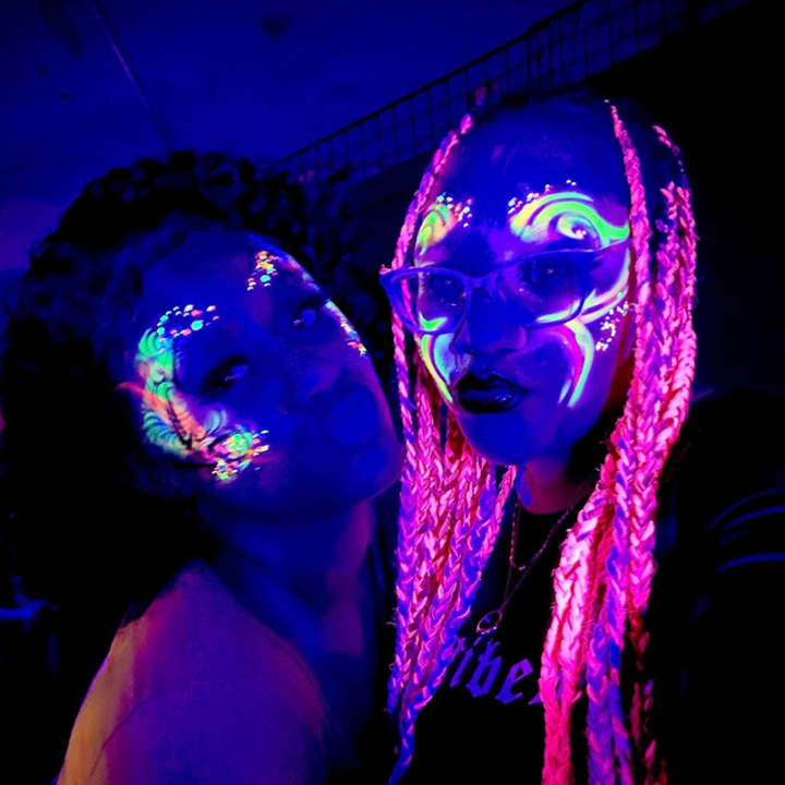 🎨 Watch creativity glow with UV-reactive face and body painting by Shanndyland Creative—turning guests into living works of art under blacklight