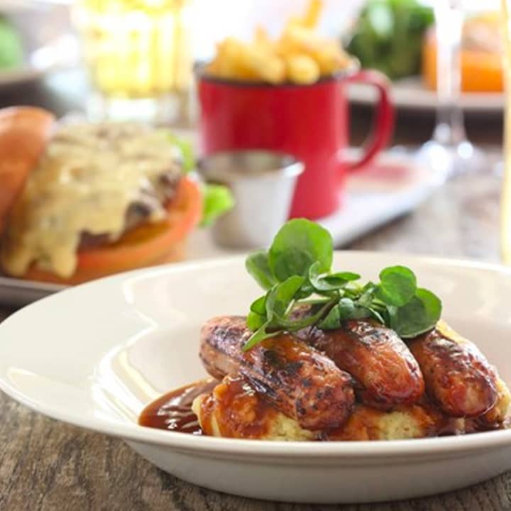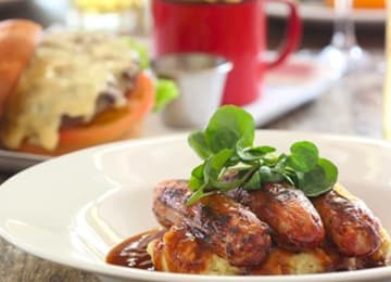 - Handmade British beef burger in a brioche bun with bacon & melted cheese, served with gherkins & fries