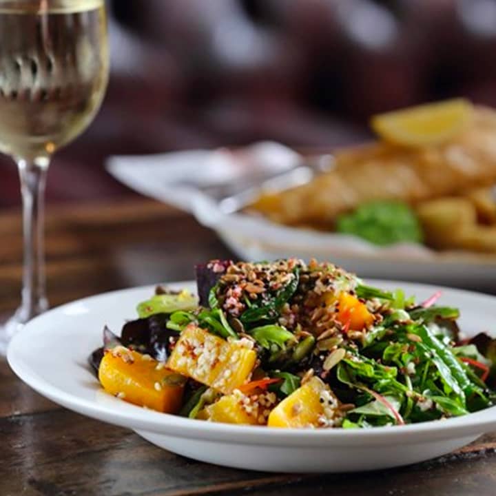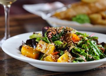 - Red pepper & quinoa burger in an ancient grain bun with marmalade-roasted beets, lentils & pickled walnuts with a herb dressing (VE)