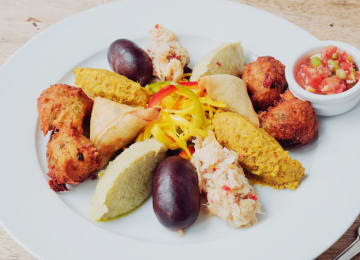 - Une assiette salée : Poulet pané, roulé de saucisse, jambon Créole, pois d’Angole et igname