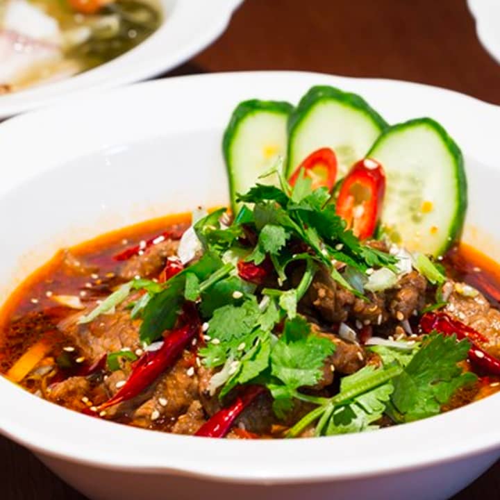 - Chicken wonton, boiled and served in a spicy Sichuan sauce