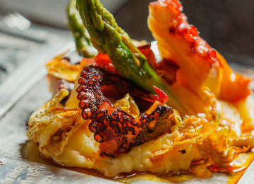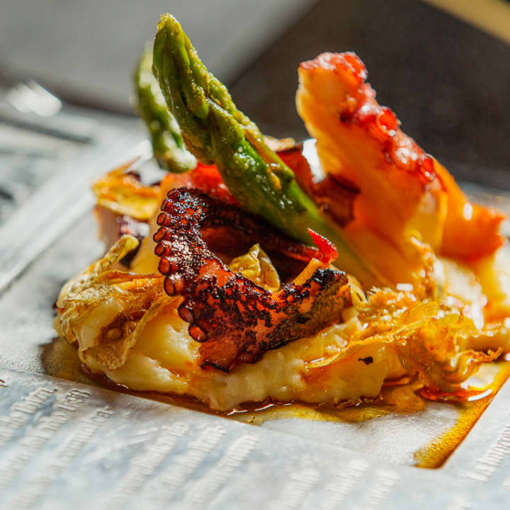 - Crispy octopus with potato, artichokes, asparagus and paprika oil
