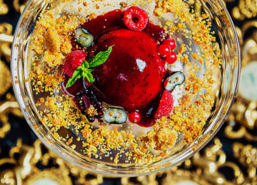 - Cheese cake with biscuit and red berry coulis