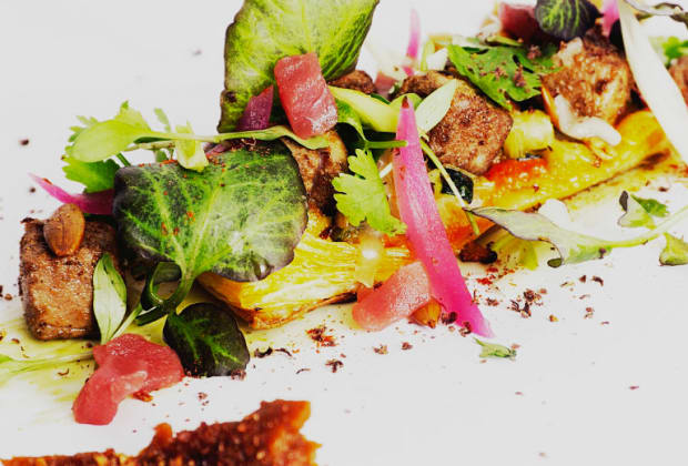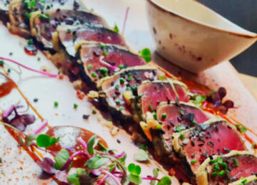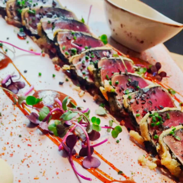 - Plato a elegir entre: tataki de atún salvaje de Almadraba tempurizado con quinoa o tartar de atún salvaje de Almadraba y buey con paté de berenjena ahumada y avellanas