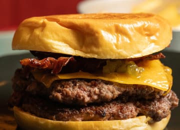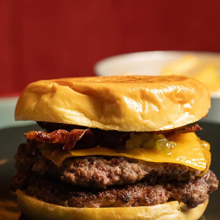 - Hamburguesa Smash clásica: doble de carne, beicon crujiente, queso fundido y encurtidos