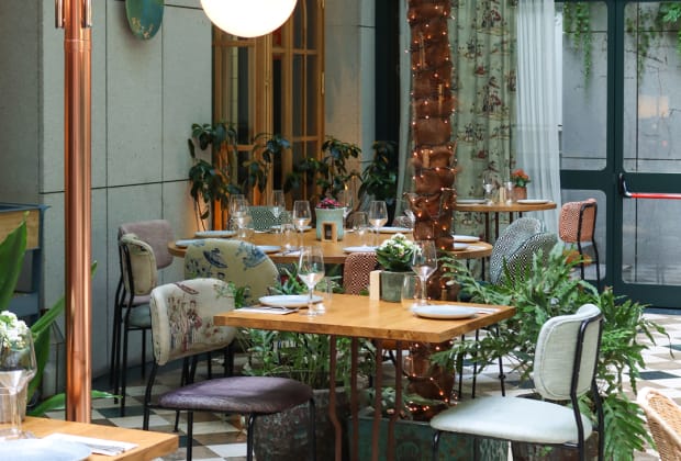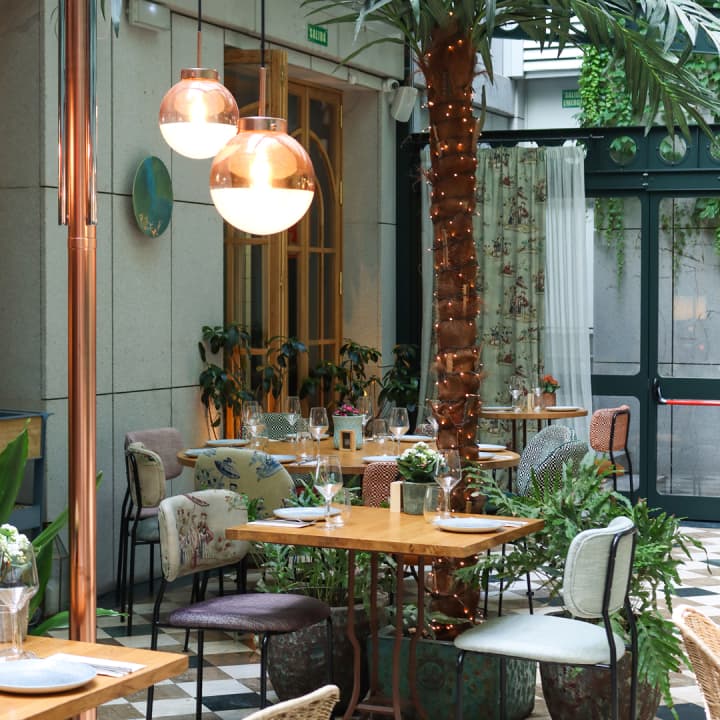 En plena Plaza de España, Botania es un restaurante luminoso y rodeado de vegetación, con un ambiente cuidado y una agradable terraza interior. Un espacio perfecto para disfrutar de una comida tranquila en el centro de Madrid.