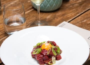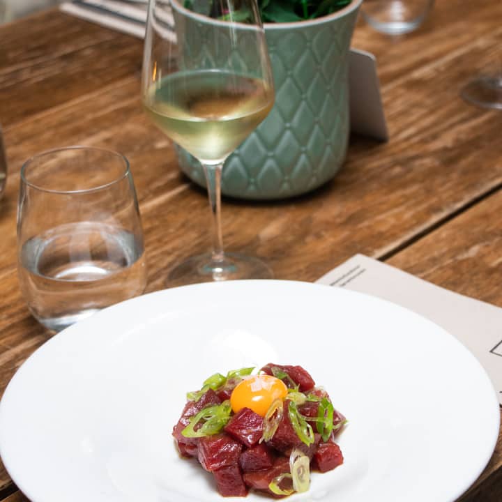 - Tartar de atún con yema de huevo, soja y aceite de oliva
