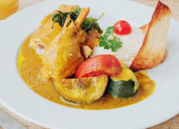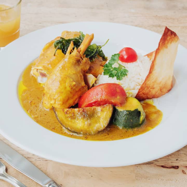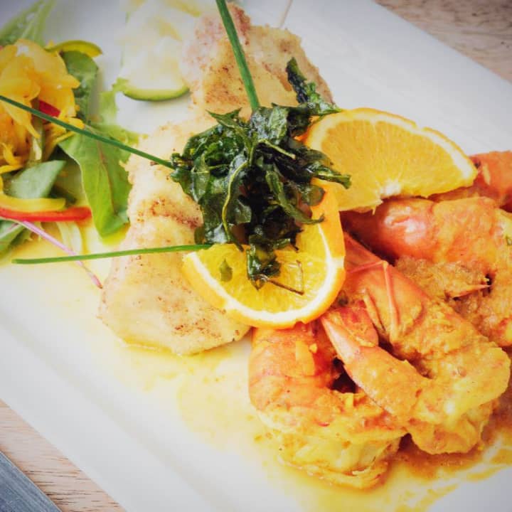 - Plat : Porcelet roussi au pois d’Angole et riz parfumé traditionnel « souskail de Gombo » ou Daube de thon rouge à l’antillaise, gratin de banane plantain, soufflé d’igname