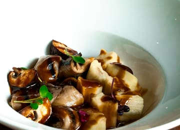 - Berenjena y setas a la brasa con caldo de verdura a la llama