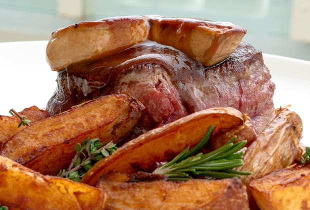 - Solomillo de vaca a la brasa, foie gras y patatas risoladas