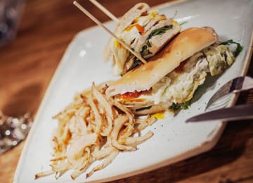 - Milán: sándwich de pollo, queso mozzarella, huevo plancha, tomate semi-seco y acompañado de cebolla crujiente