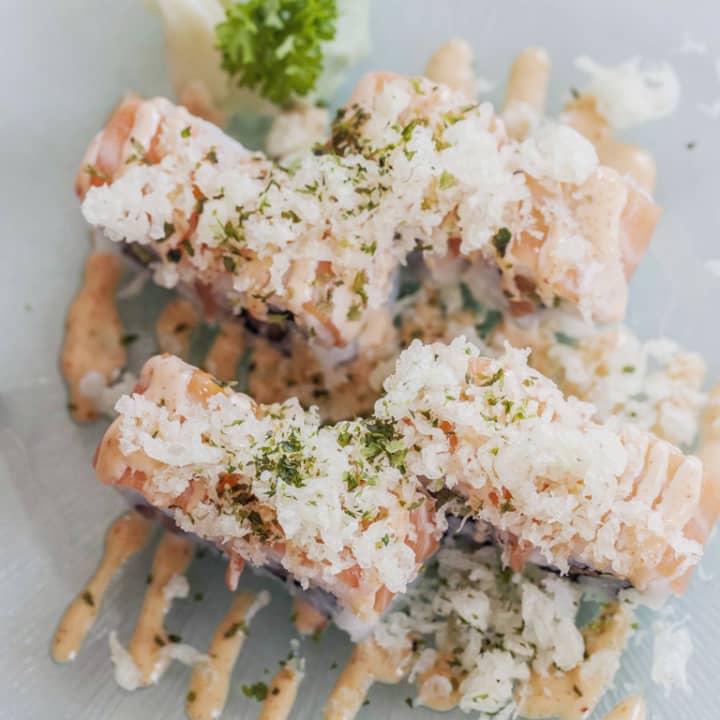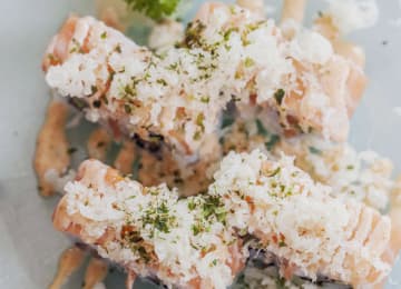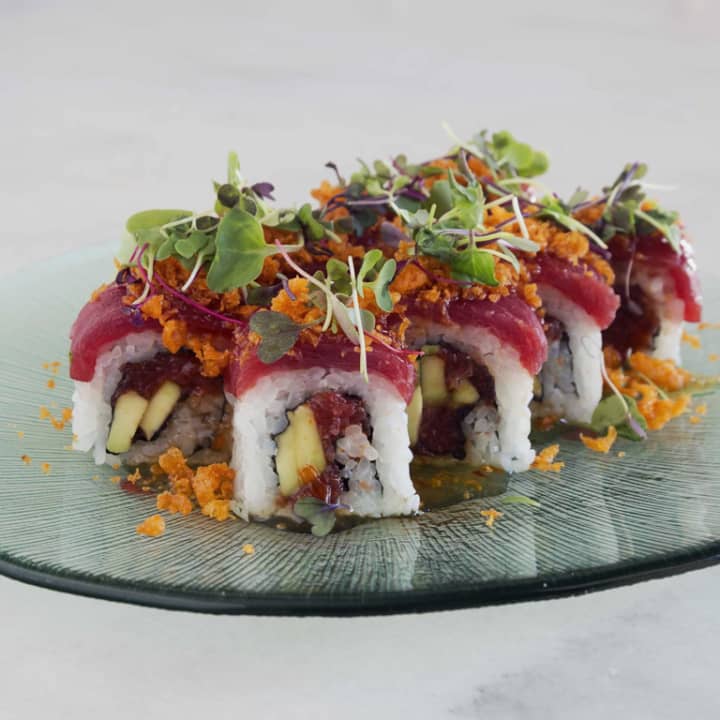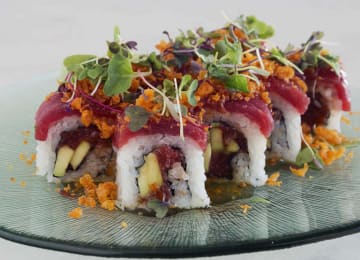 - Segundo, a elegir entre: NY roll (maki de salmón y aguacate), salmón flambeado (uramaki salmón, aguacate y tanuki, mojo negro) o california (huevas, langostino ebi, aguacate, queso crema)