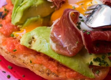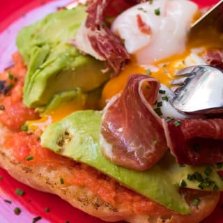 - Pan de cristal, tomate untado, aguacate, jamón ibérico y huevo a baja temperatura
