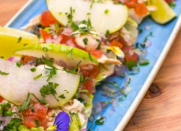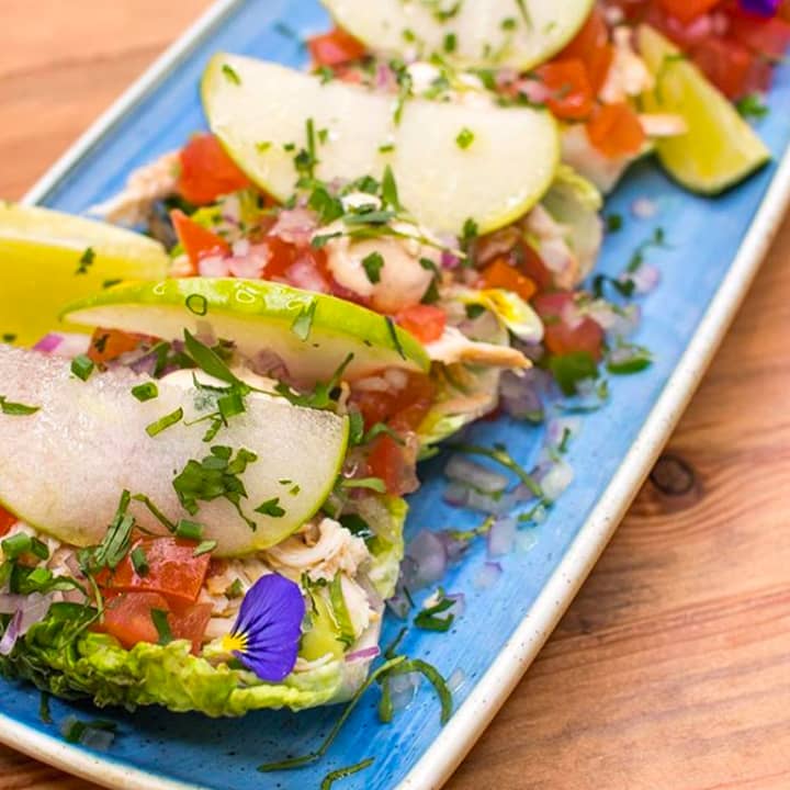 - Tacos de cogollo, pollo rustido, aguacate, pico de gallo, manzana encurtida, mayonesa de chipotle y lima