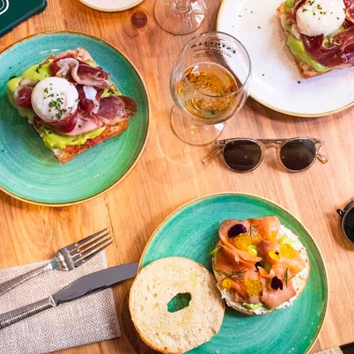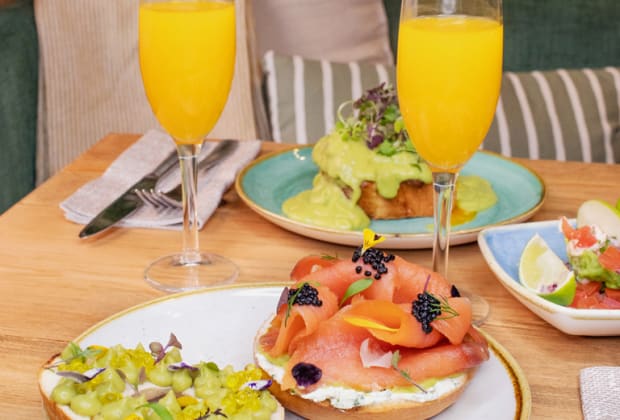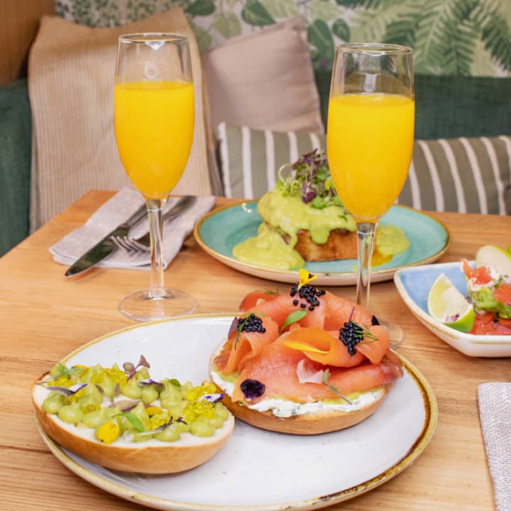 - Bagel, queso crema con hierbas, aguacate, salmón ahumado y caviar de aceite