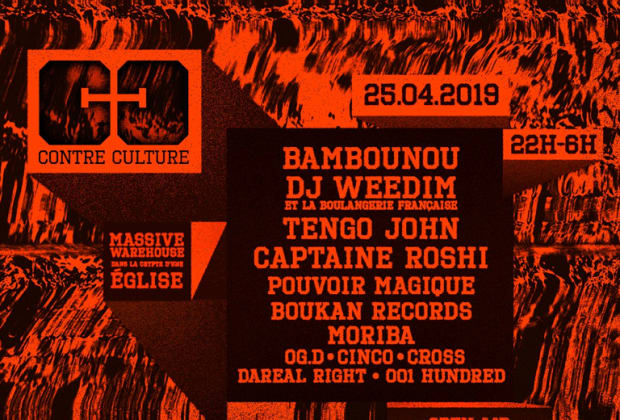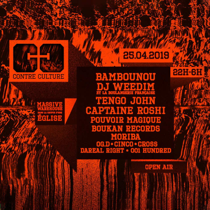 Bambounou, Dj Weedim & La Boulangerie Francaise, Boukan Records, Moriba, Tengo John, Cinco, Captaine Roshi, Cross, Og.D, Darealright, 001 Hundred & Guest se retrouvent dans la crypte d'une église abandonnée pour célébrer la contre culture ! Pour la première de la C.C, nous t'invitons à venir secouer la scène underground aux portes de Paris ! Rendez-vous le jeudi 25 avril 2019 pour 8h de gros son Rap, Tribal House et Techno !
