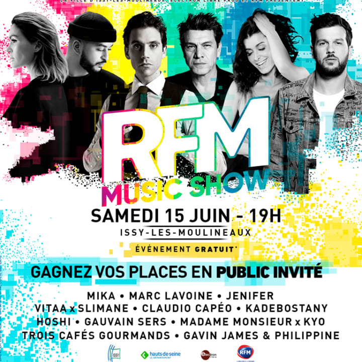 RFM crée à nouveau l’évènement avec le RFM Music Show le samedi 15 juin 2019 dès 19h au Parc de l'Ile Saint-Germain à Issy-les-Moulineaux. Cette année encore, la radio du meilleur de la musique réunira sur scène les plus grands artistes du moment pour un show hallucinant. Seront présents : Mika, Jenifer, Marc Lavoine, Slimane, Vitaa, Claudio Capéo, Hoshi, Kyo, Gauvin Sers, Madame Monsieur, 3 Cafés Gourmands, Gavin James & Philippine, Kadebostany… pour plus de 2h de live !