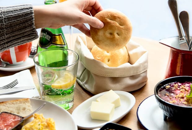 Servido con pan rústico de masa madre y tortas de aceite, mantequilla y mermelada o aceite y tomate