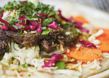 On a flatbread with harissa hummus, pickled veg, aubergine & tomato 'bayildi' and picked red cabbage
