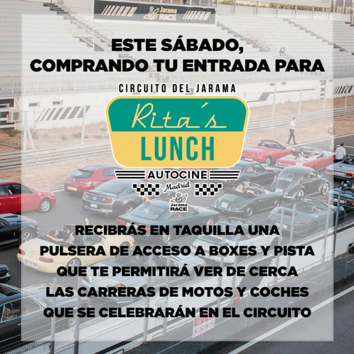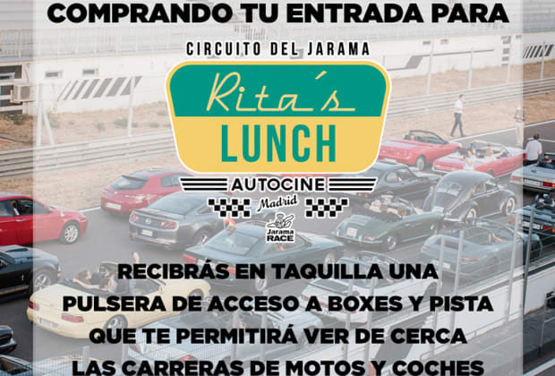 ¡Rita's Lunch Autocine llega al circuito del Jarama! Descubre su amplia terraza con mucho espacio al aire libre y pasa un rato en grande en el evento de moda de la zona norte de Madrid. Disfrutarás de un sábado agradable con música en directo, actividades infantiles, foodtrucks y cócteles. Además, dispondrás de zona pet-friendly por si deseas llevar a tu mascota a este evento. ¡Pásate y disfruta de una experiencia top!