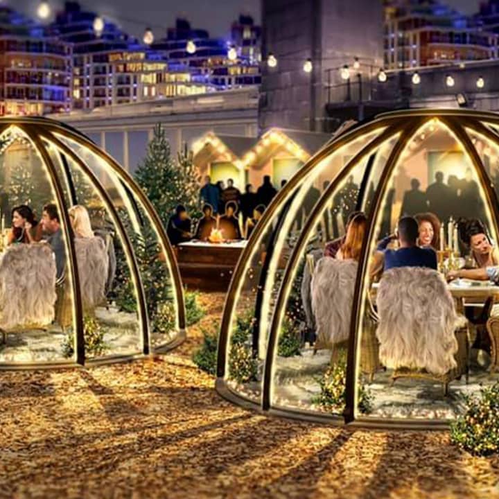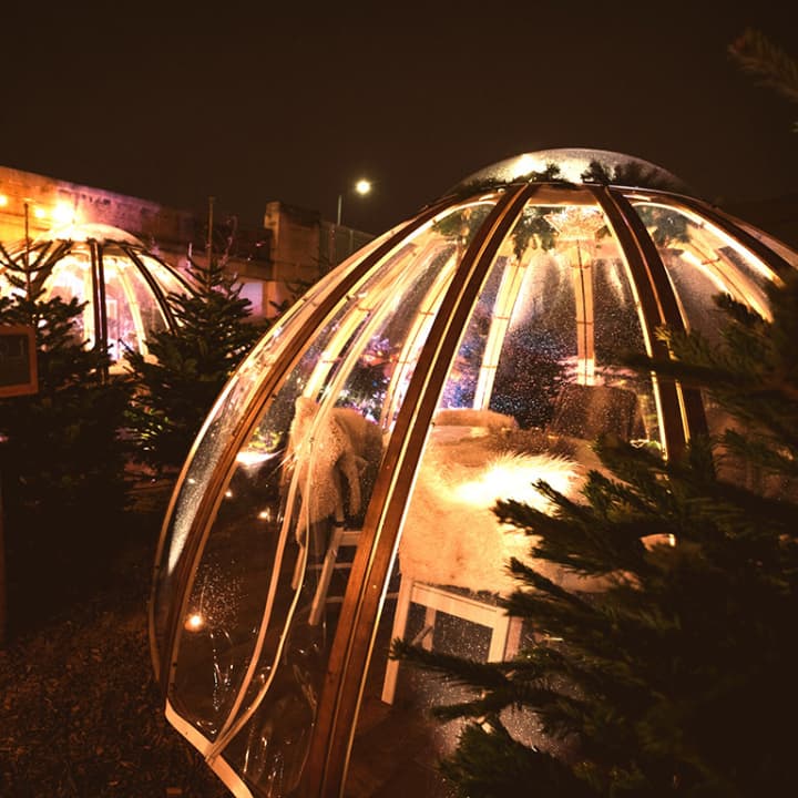 ❄️ Venue with Alpine Lodge Tables, Forest Cabins, Forest Igloos, a Bavarian Beer Tent (drink steins of German beer), fur-covered sofas for groups of 4-6 people, ski-lift bubbles for romantic dates, and an outdoor fire pit (for roasting marshmallows on!)