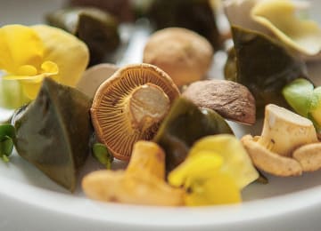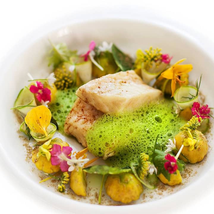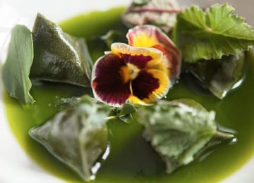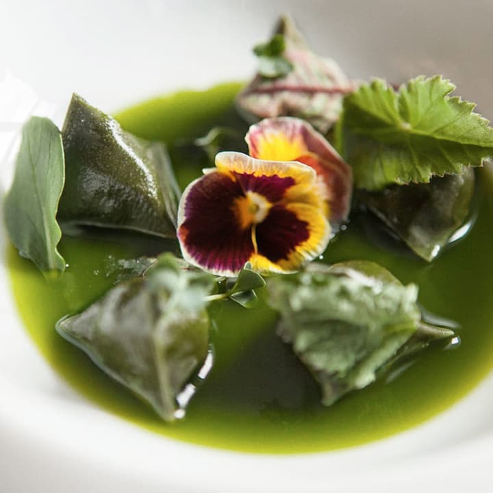 - Les berlingots au crémeux de chèvre de Banon fumé, consommé de cresson au the matcha, au gingembre et à la bergamote