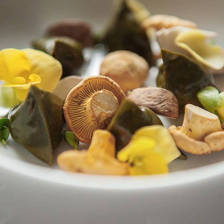 - Les choux pluriels et le lard de Colonnata, consommé cristallin au citron Meyer et le géranium Rosat