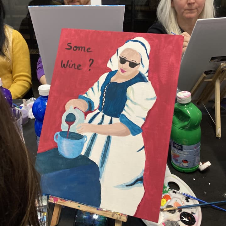 - Super concept, très bon moment (presque un peu court, 2h30 ça passe très vite). Un peintre présent pr nous aider si on le souhaite, suffisamment de matériel et de couleur pour tout le monde (pas de galère à devoir attendre ou s'échanger des choses), et une équipe au petit soin notamment pr remplir nos verres 😂
