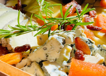 - 1 bocal de tapenade thaï de La Maison de la tapenade + 1 barquette de fromages (comté fruité et crottin de chèvre) avec des abricots moelleux et des raisins secs
