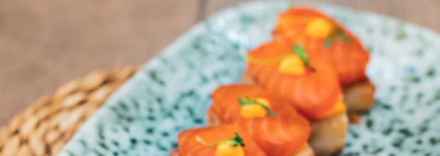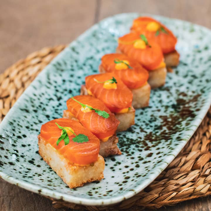 - Sashimi de salmón sobre arroz crujiente y mahonesa de kimchi