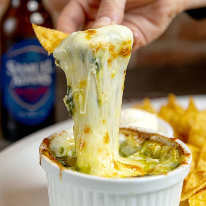 - Dip de espinaca y alcachofa con queso fundido, acompañado de tortillas de maíz hechas en casa