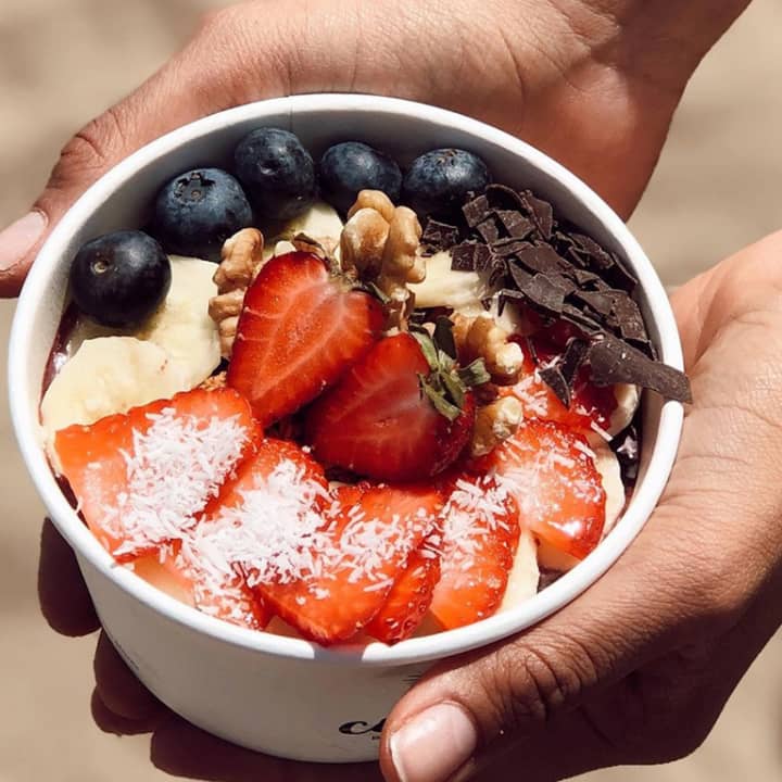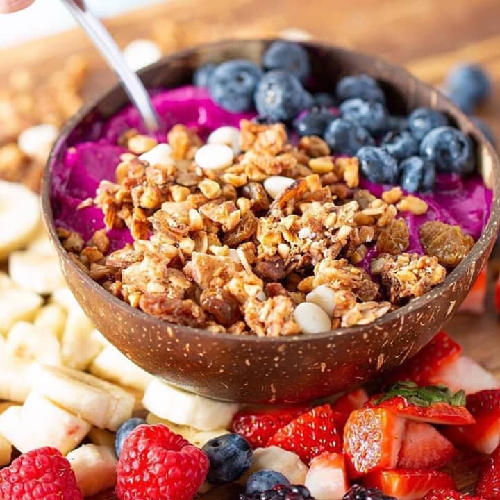 - Yogur natural con coco, granola casera, chia, fruta fresca y coco